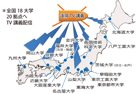 *)20TV拠点(令和元年度時点):北海道大学、八戸工業大学、長岡技術科学大学、茨城大学(日立・水戸)、早稲田大学、東京工業大学、東京都市大学、東海大学、山梨大学、金沢大学、名古屋大学、福井大学(文京・敦賀)、京都大学、大阪大学、近畿大学、大阪産業大学、岡山大学、九州大学